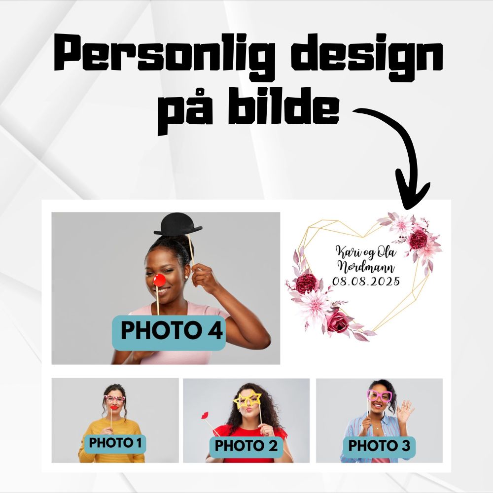 Gjør bildene fra fotoboksen enda mer spesielle med vår tjeneste for personlig design! Enten det er til bryllup, barnedåp, bursdag, utdrikningslag eller andre anledninger, kan du nå tilpasse både digitale og utskrevne bilder med egne grafiske elementer, logoer eller personlige meldinger. Med våre ferdiglagde designmaler eller muligheten til å sende oss ditt eget design, får du akkurat det uttrykket du ønsker.